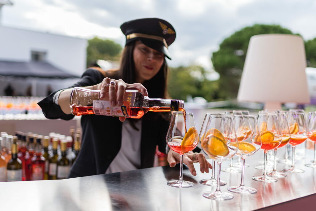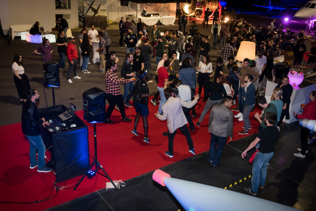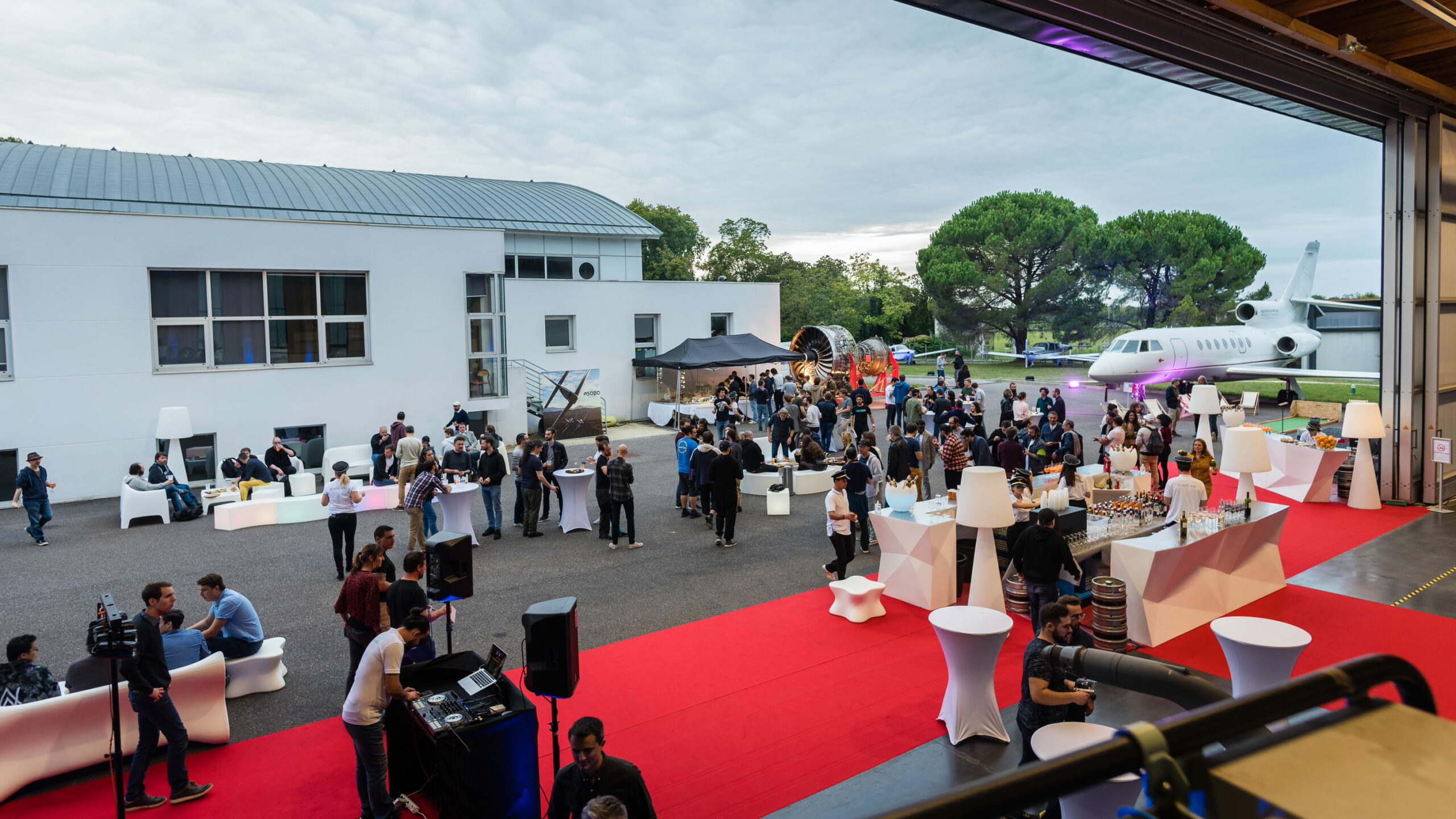 La transition naturelle de la journée vers la soirée. Un cocktail dinatoire en extérieur sur le tarmac, avec le coucher de soleil en fond puis la musique qui monte, le bar à cocktails qui s’anime, et une soirée DJ qui transforme l’Aerocampus en piste de danse à ciel ouvert. Le lieu qui continue de travailler même quand le programme officiel est terminé.