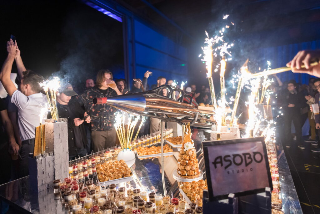 Un gâteau spectaculaire sur le thème de l’aviation pour une équipe qui a passé des années à modéliser des avions, c’est une commande qui ne s’improvise pas. Brief au pâtissier, validation du concept, transport, mise en scène au moment de la révélation : le gâteau final est une production en soi, pensée comme un moment de la soirée à part entière.