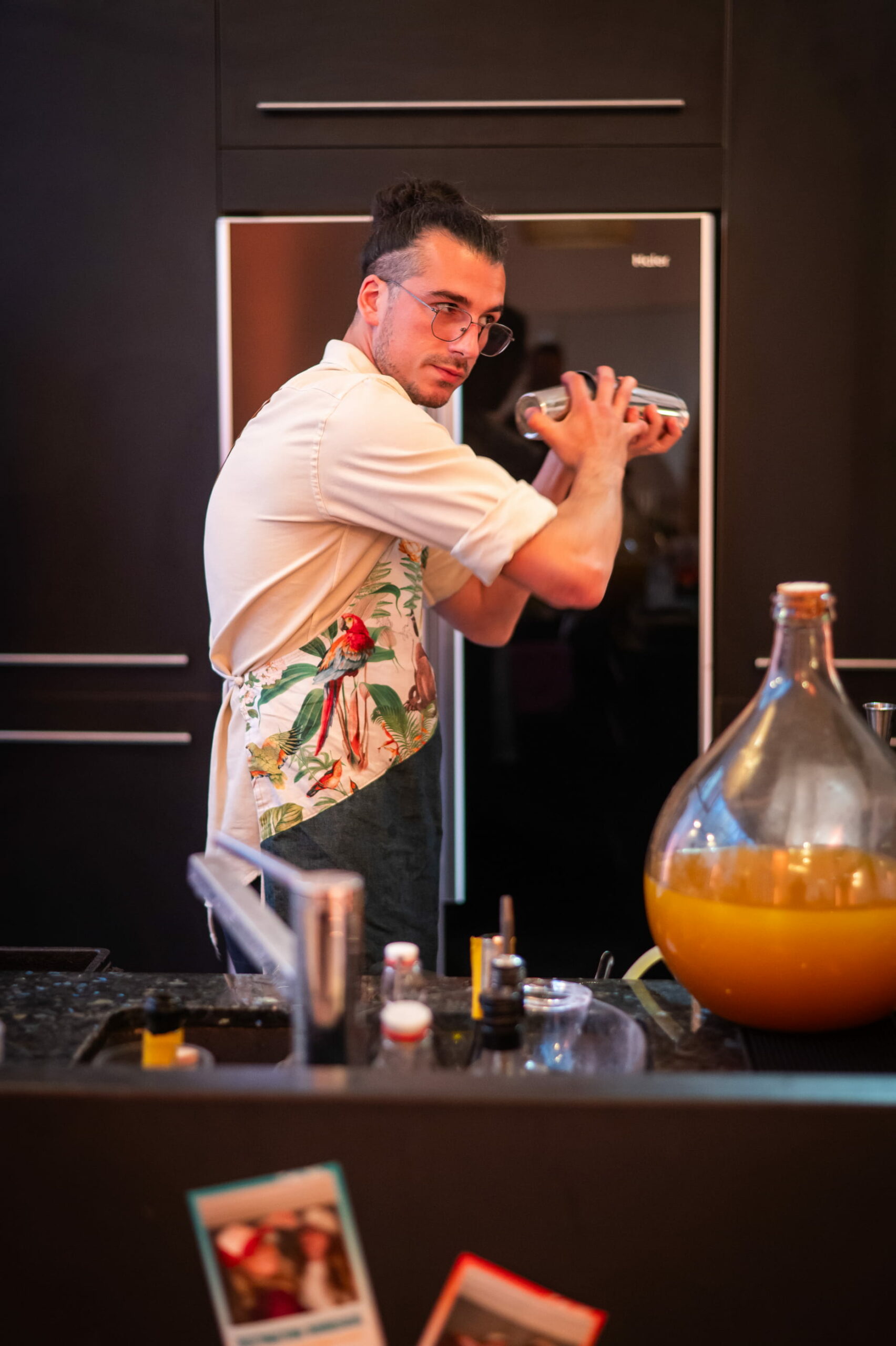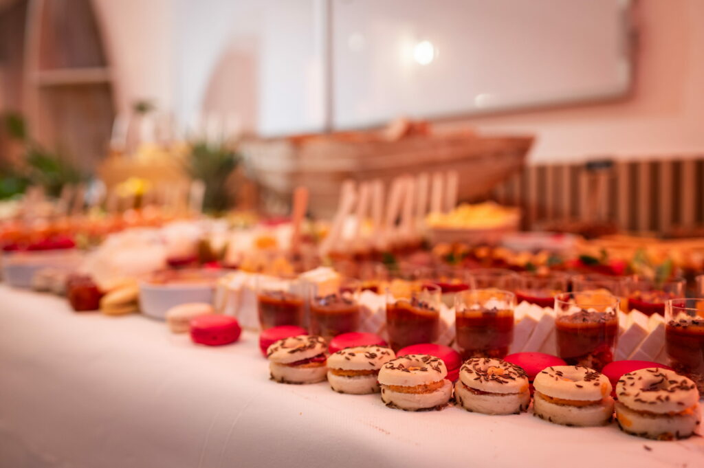 Une table de dégustation continue : fromages, charcuteries, fruits, pains artisanaux pour que les invités grignotent, s’attardent, reviennent. Des cocktails signatures créés pour la soirée, qui deviennent eux-mêmes un sujet de conversation. La table comme espace de lien autant que de plaisir.